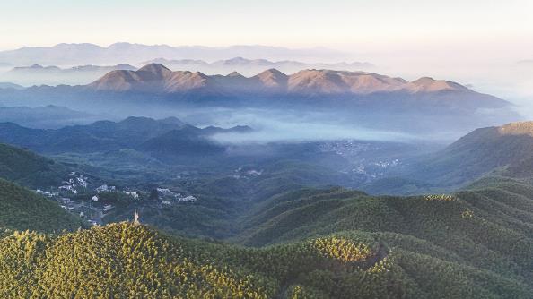 图为浙江安吉绵延的竹海、错落有致的民宿在秋日暖阳下相互映衬